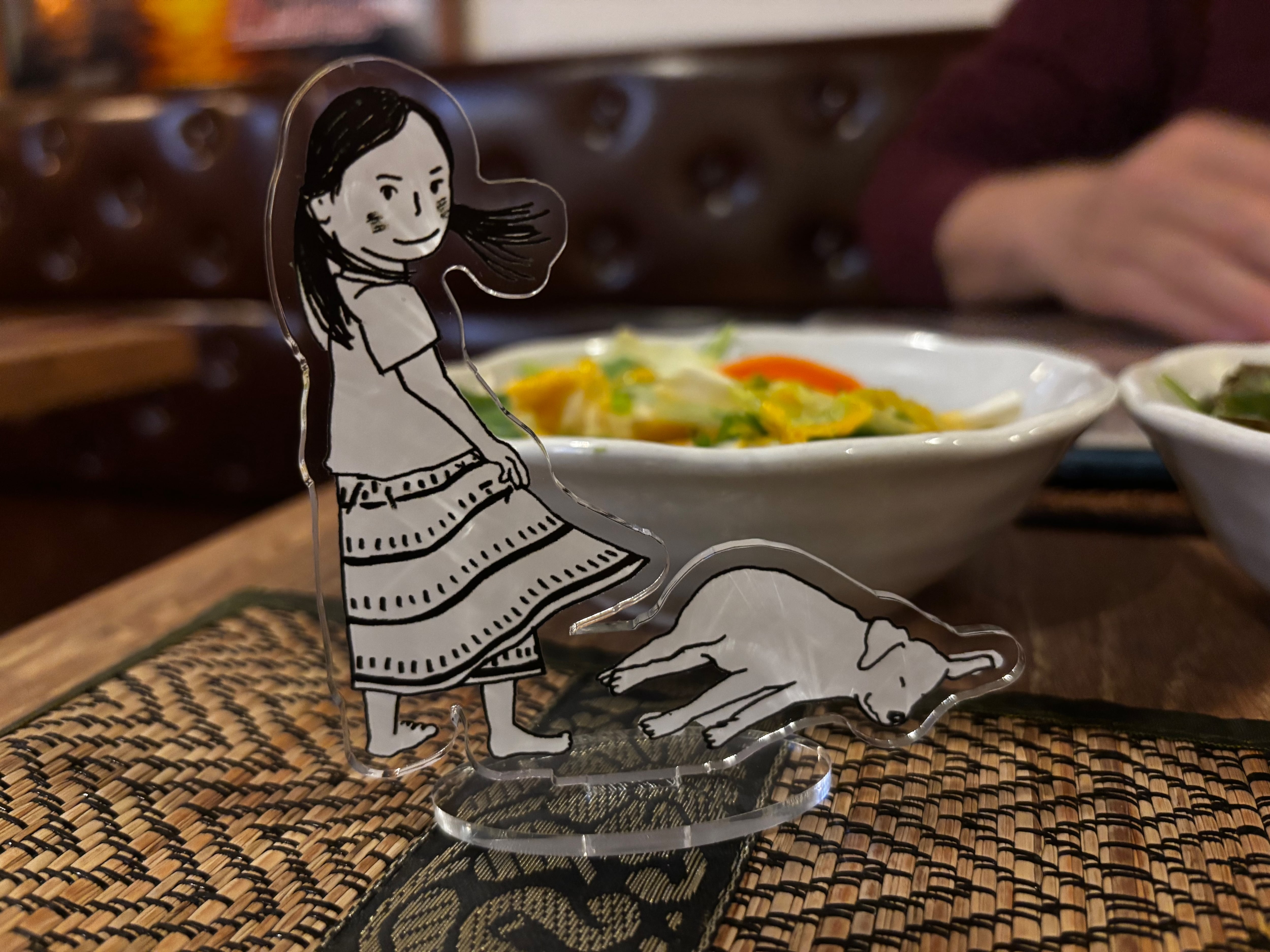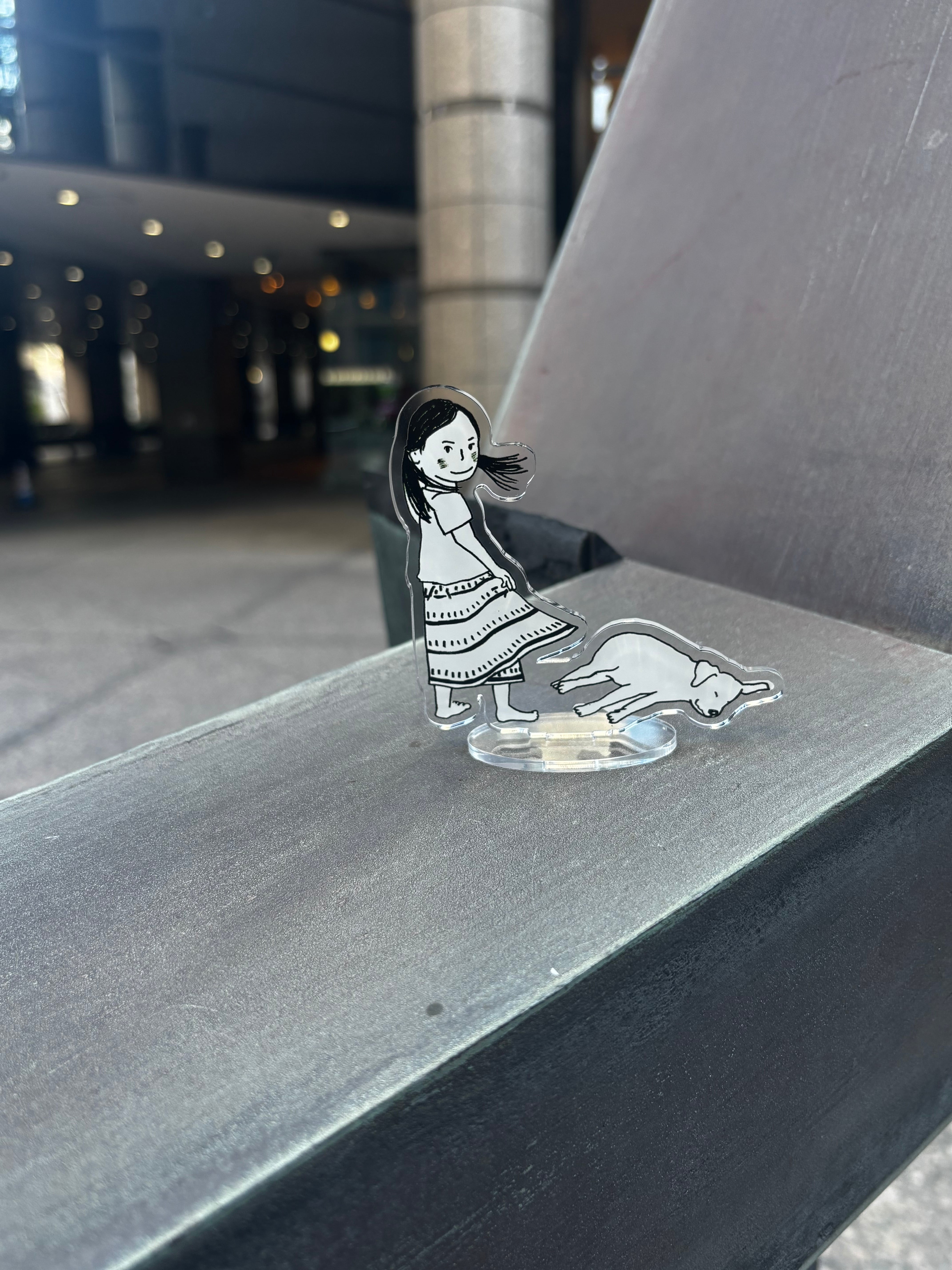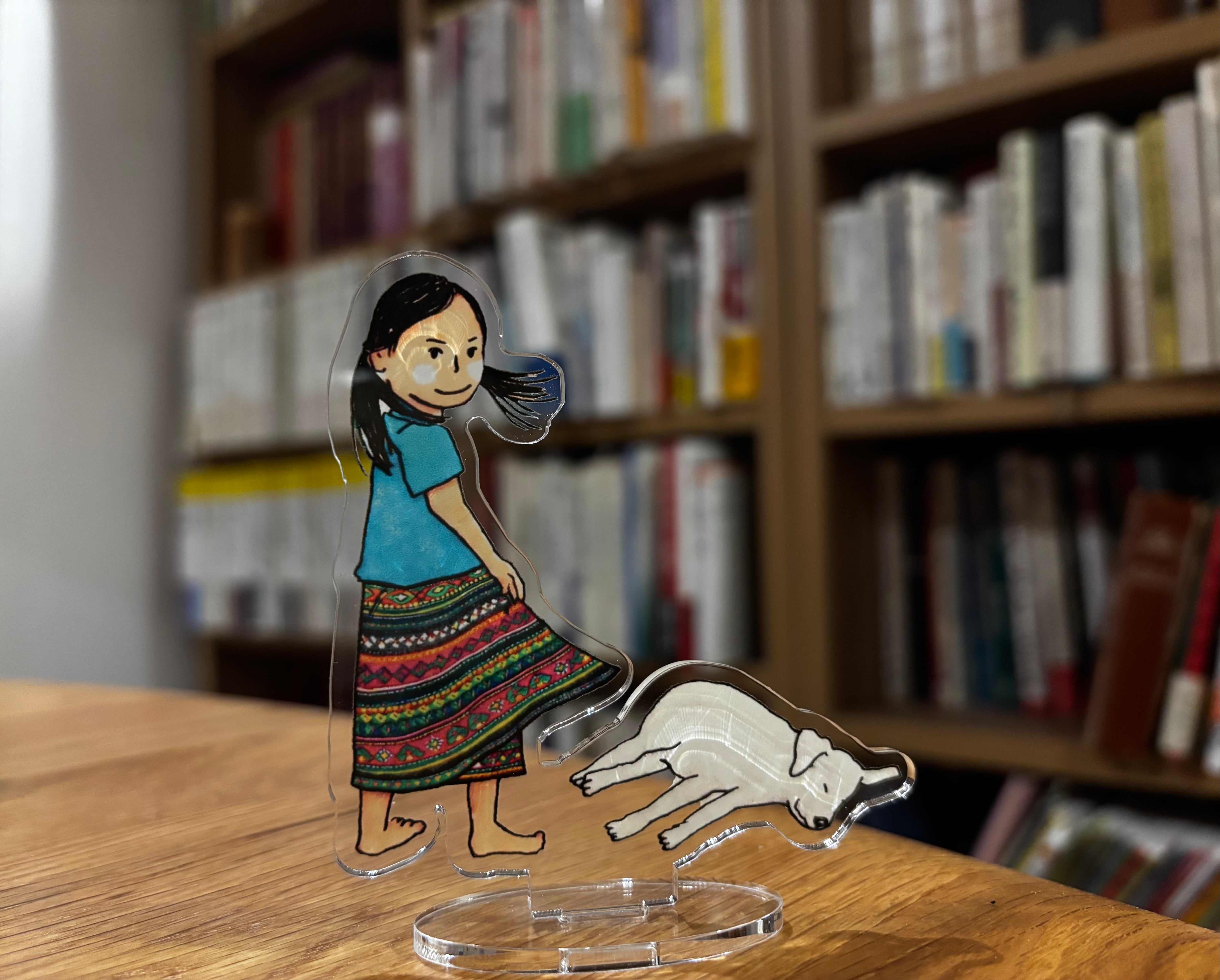 アトゥトゥミャンマーのロゴ、アトゥトゥガール&ドッグ(イラスト 金井真紀さん)のアクリルスタンドでミャンマー市民、ミャンマールーツのともだちへの支援ができます。